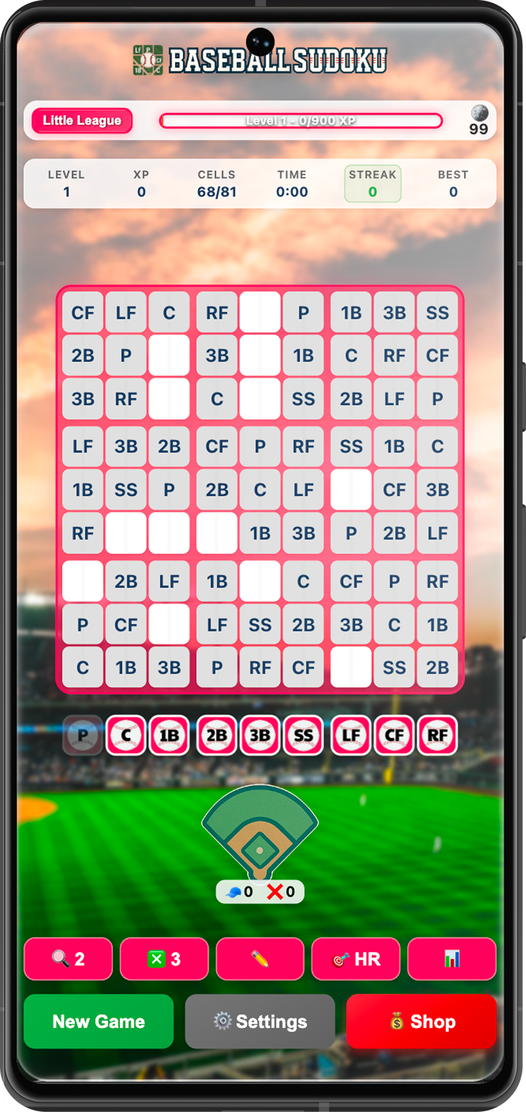 Same rules you know. Completely different vibe. Place baseball positions instead of numbers, and every puzzle feels like setting the lineup.